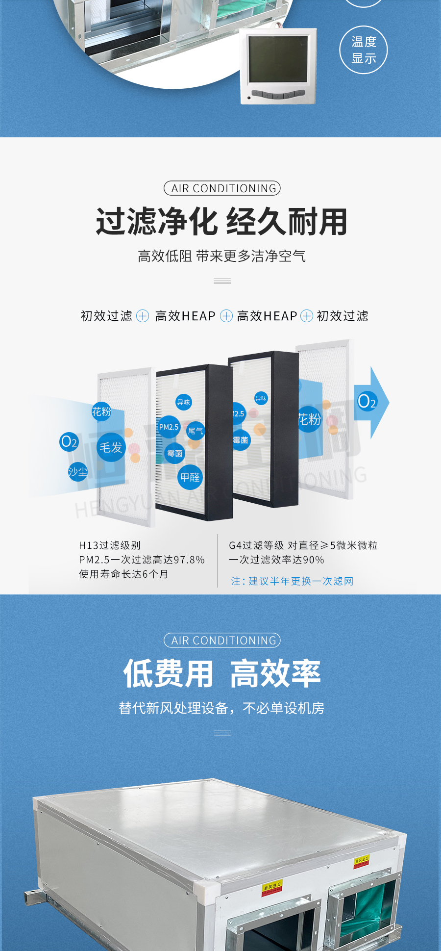 靖江市恒源空調設備制造有限公司——新風換氣機是根據在密閉的室內一側送風另一側引風,則在室內會形成“新風流動場”的原理進行設計研制的。它依靠機械送風、引風,強迫在系統內形成新風流動場。是一種時刻保持室內空氣潔凈清新的新型環保電器。這種獨立的室內空氣置換、凈化循環系統,能在排除室內的污染空氣的同時,輸入自然新鮮空氣,將輸入室內的新風先經過濾、殺菌、加熱、增氧等多項處理。